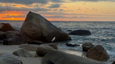 The dynamic beach has both soft sand and sculptural rocky outcroppings. A newly formed cove makes for entering the water to swim, snorkel, paddle board, or kayak very easy.